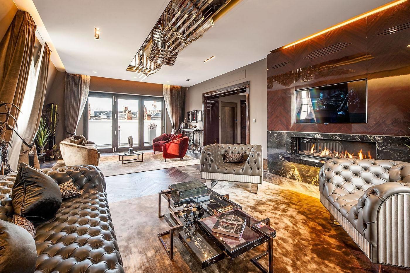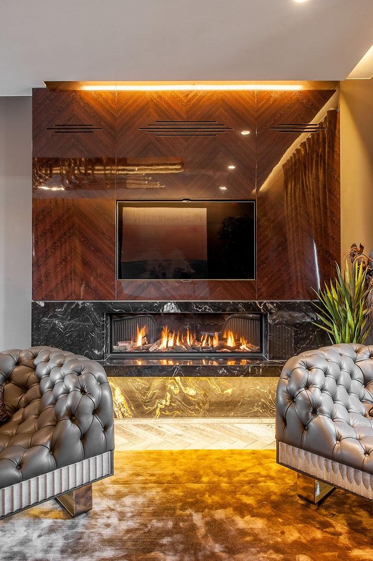 Пространство вокруг каминной топки облицовано крупными плитами полированного гранита Black Forest. Витиеватый рисунок светлых полос на черном фоне соответствует эклетичной стилистике всего помещения.