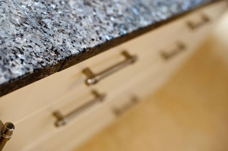 Столешницы на этой кухни выполнены из одного из самых декоративных сортов камня - гранита Blue Pearl. С геологической точки зрения, Blue Pearl является лабрадоритом - породой, состоящей из минеральных хлопьев синего мерцающего минерала лабрадора. Лабрадор обладает свойством иризации - он переливается в сине-голубых оттенках.