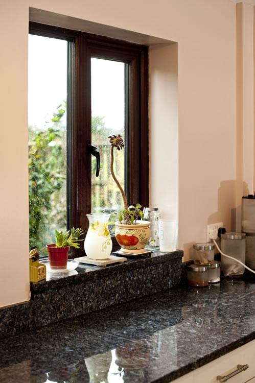 Этим камнем покрыты все столешницы. Из него же выполнены невысокие плинтуса. У окна плинтус поднимается вверх, переходя в каменный подоконник.