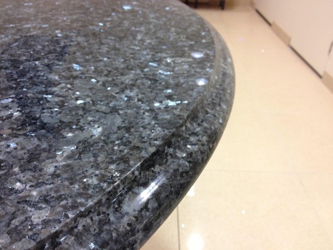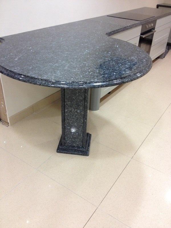 Пример создания уникальной столешницы, разработанной по индивидуальному дизайну. Заказчик загорелся идеей совмещения двух элементов в различных стилях: столешница периметральной рабочей зоны переходит в кругый обеденный стол. Центр круглого стола подпирается крепкой квадратной ножкой, склеенной из полос того же камня.