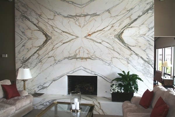 1) облицовка простраства вокруг камина цельными слэбами; 2) раскладка слэбов "бабочка".