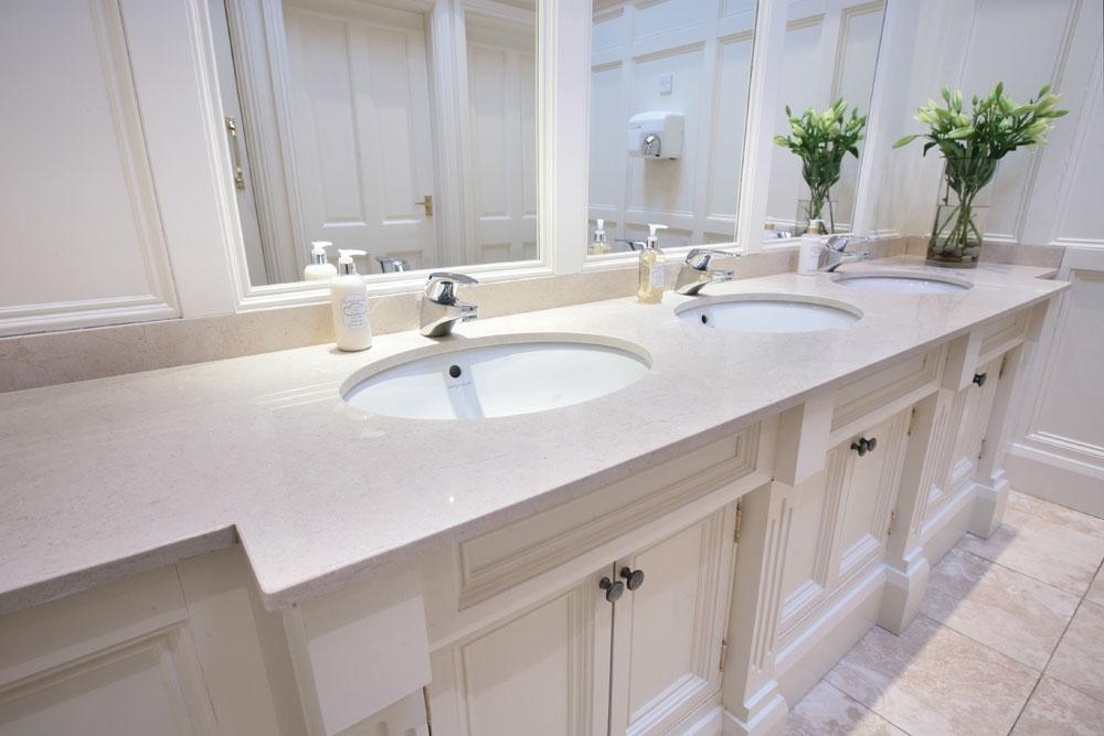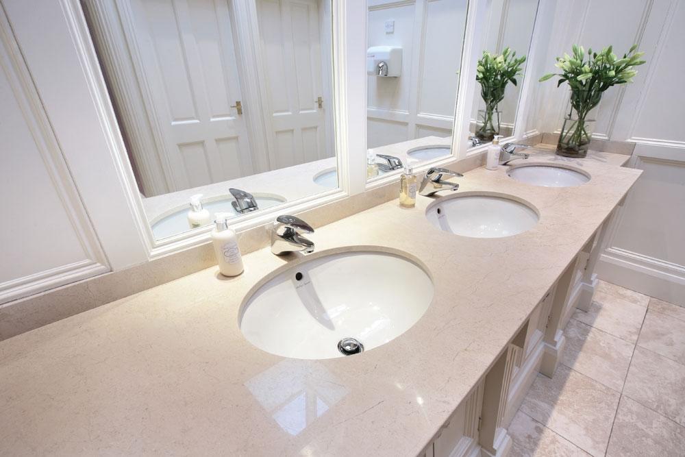 Но нас, конечно, в первую очередь интересует природный камень. Обратим же внимание на столешницу с вырезанными отверстиями под три мойки. Она выполнена из слэба полированного Botticino - мрамора из Италии, уже много лет являющегося образцом классической каменной красоты.