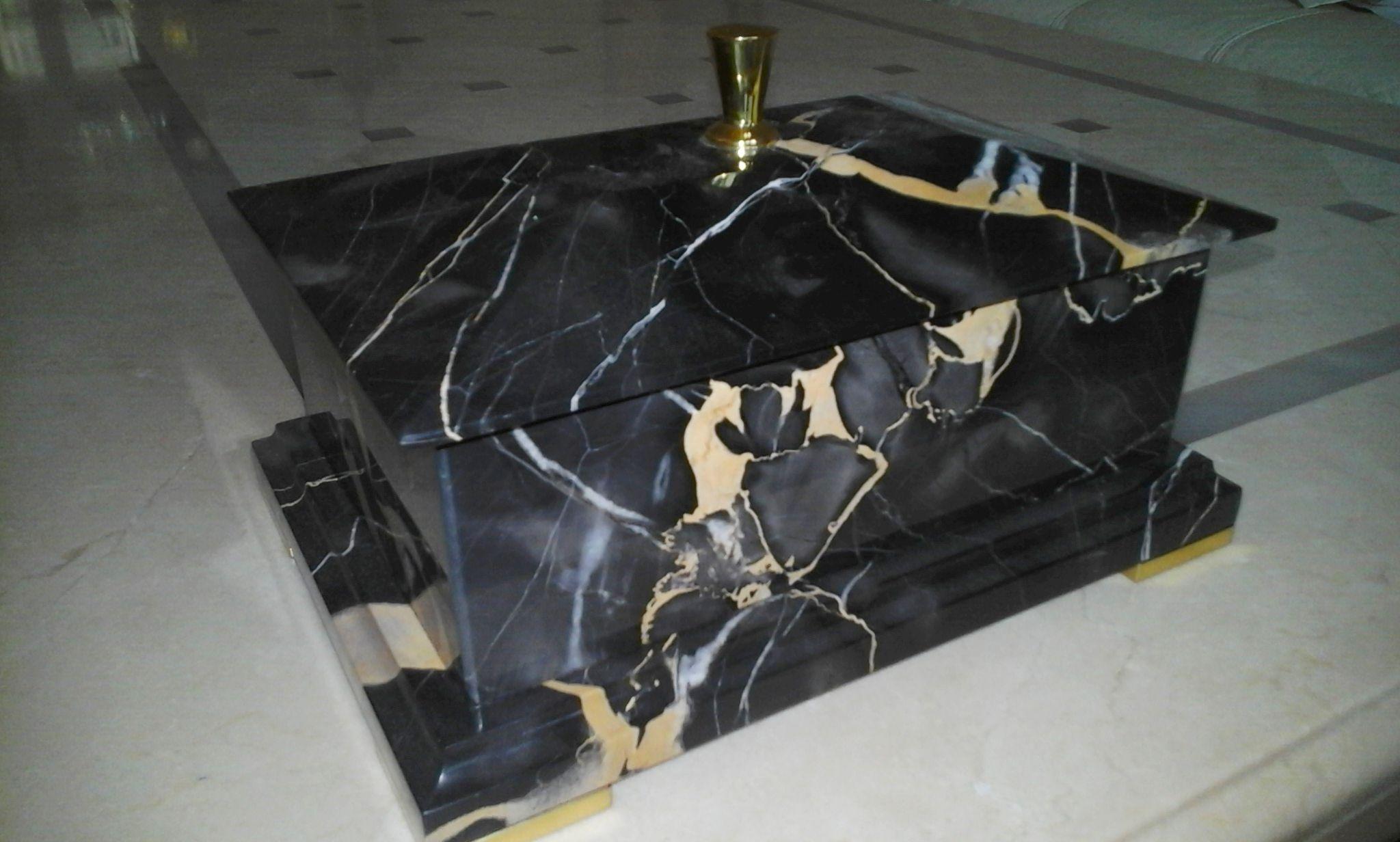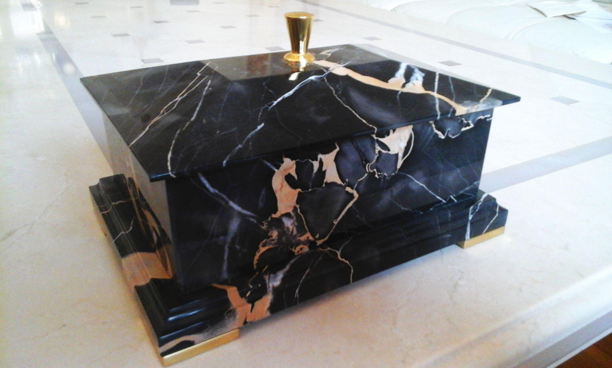 Мастера "Камнемира" продолжают создавать единичные и абсолютно уникальные сувениры из природного камня. Теперь речь идет об изготовлении шкатулки для драгоценностей. Для соответствия в качестве материала был выбран один из самых дорогих сортов мрамора в мире - Nero Portoro.