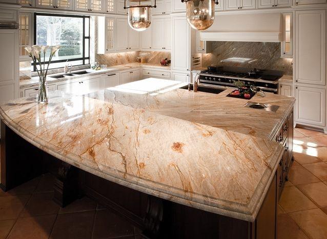 Большой кухонный стол, все рабочие поверхности кухни, а также элементы облицовки стен выполнены из изысканного кварцита Brazilian Dream. Сверхпрочный камень с перламутровым блеском органично смотрится в классическом интерьере кухни.