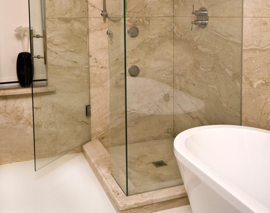 Крупными плитами этого мрамора облицованы все стены. Из него выполнен поддон для душевой, подоконник, а также столешница, обрамляющая зону раковин. Столешница выполнена из деталей, вырезанных из 2-сантиметровых слэбов. Методом склейки изделие превратилось в массивную конструкцию модной П-образной формы.