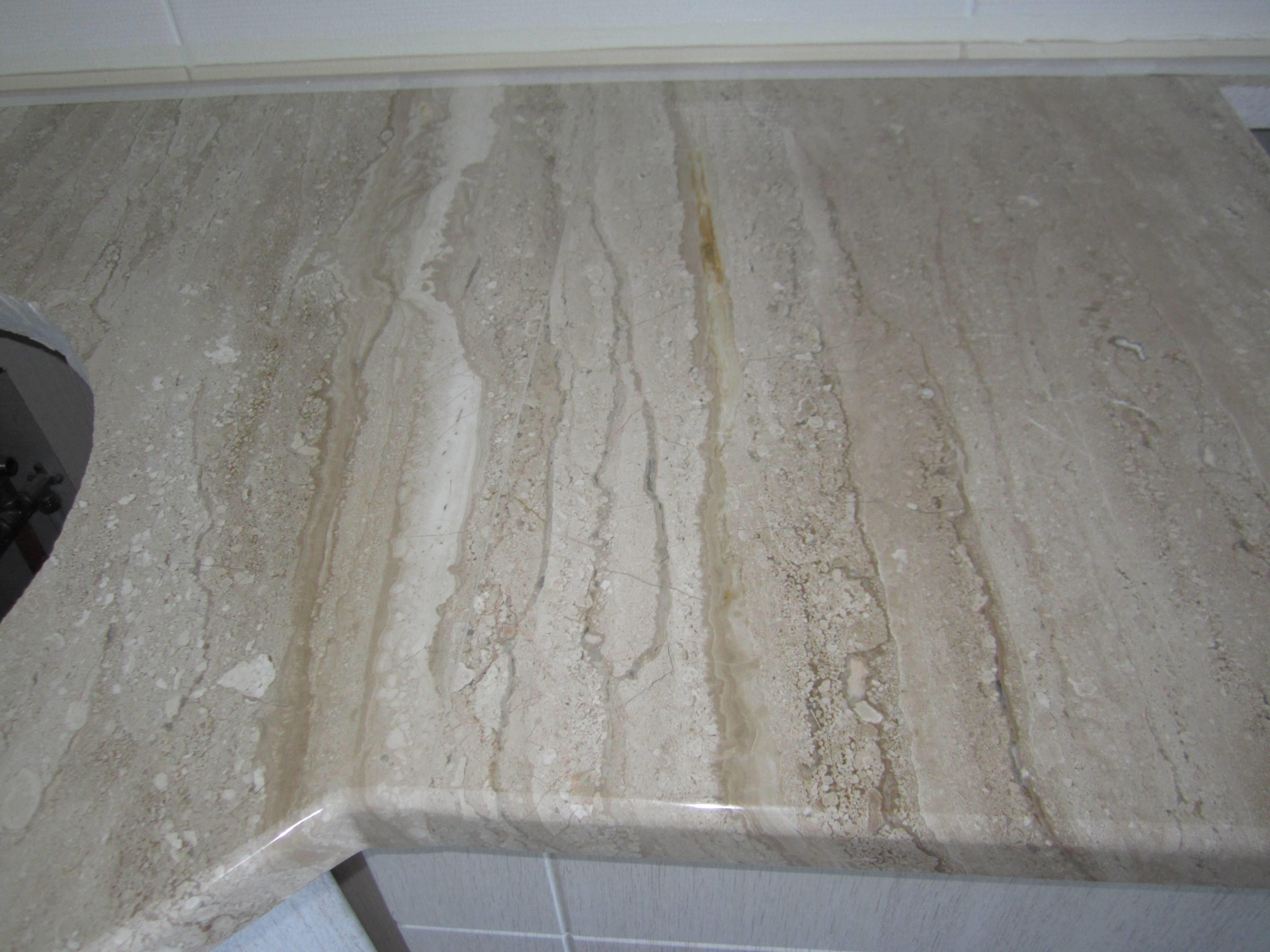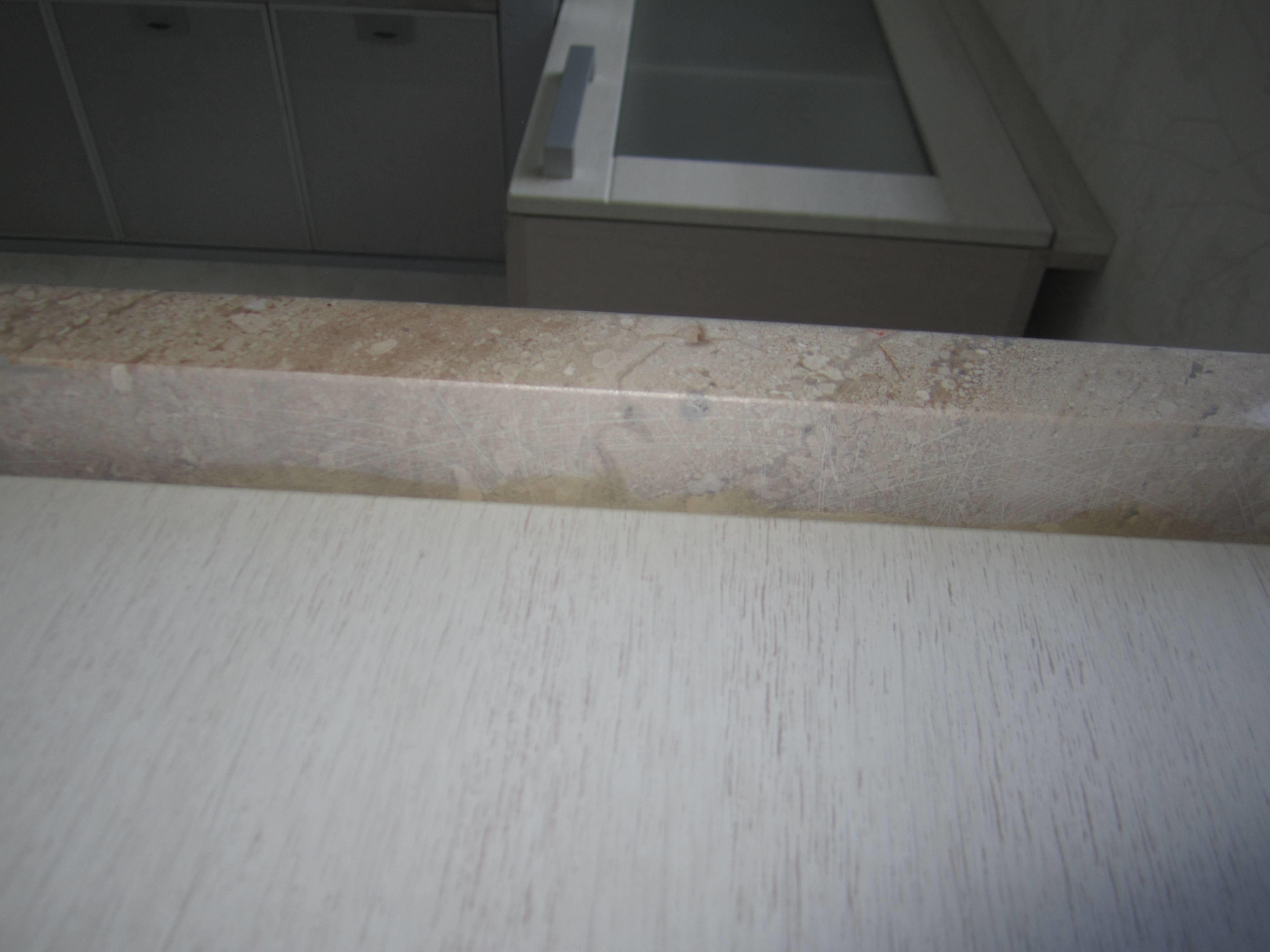 В столешнице вырезаны все необходимые отверстия для раковины, кранов и варочной поверхности. Торцевой профиль - классический квадратный с мягким закруглением.