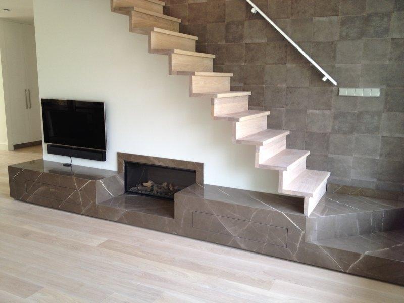Перед нами проект оригинальной современной отделки. Интерес его заключается в необычном распределении пространства, его конструкции. А конструкция, облицованная мрамором Bronze Amani, представляет собой нижний ярус помещения. Она является необычной тумбой, соединенной с камином, переходящей в две нижние ступени лестницы. Согласитесь, очень эргономично и хитро? При этом композиция выглядит вполне современно и стильно.