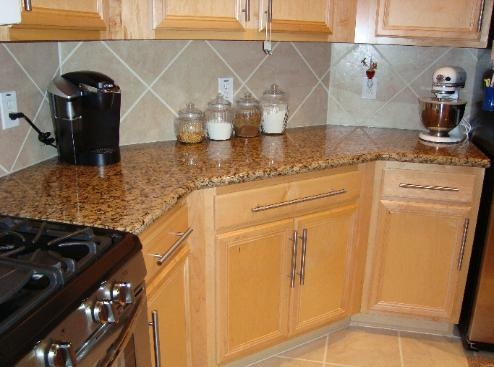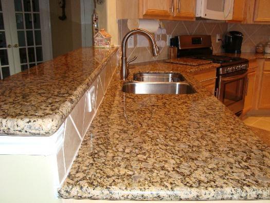 Камень подобран под цветовую гамму всей кухни - цвет деревянного гарнитура и облицовочной плитки.