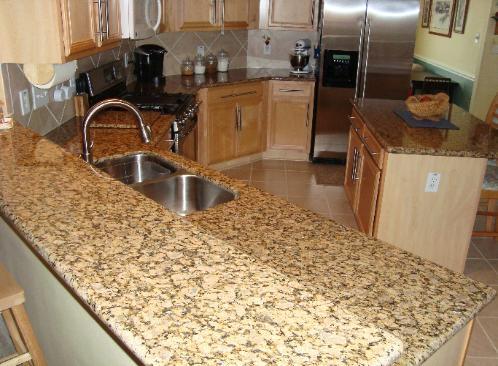 Столешницы по периметру кухни, а также кухонный остров по центру - все выполнено из полированного гранита Butterfly Gold.
