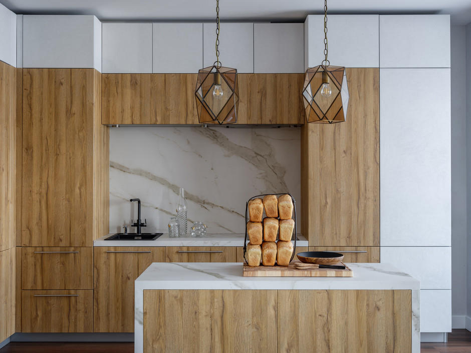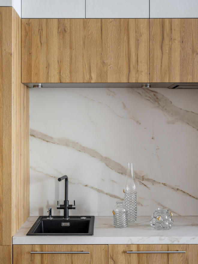 Столешницы и фартук выполнены из элегантного мрамора Calacatta Gold с золотистыми прожилками.
