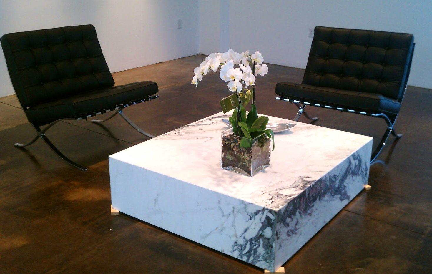 Этот журнальный или кофейный столик производит впечатление монолитности - он будто бы вырезан из массивного блока породы. Даже рисунок на гранях совпадает. Но на самом деле столик образован склейкой каменных полос и плиты, распиленных от одного слэба.