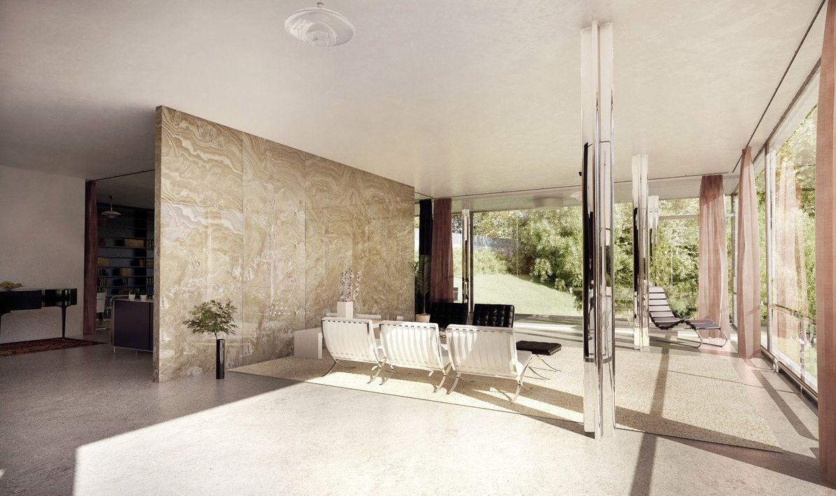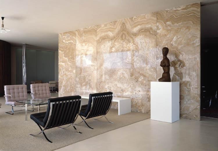 Декоративная стеновая панель из оникса зонирует пространство, являясь модным дополнением интерьера. Панель облицована прямоугольными плитами оникса Onyx Caramel. Использовался камень с полированной фактурой и текстурой Cross Cut (узорчатый рисунок, характерный для распиловки поперек прожилковатости).
