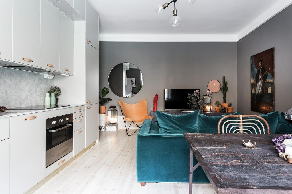 Перед нами современный и модный проект кухни, совмещенной с гостиной.