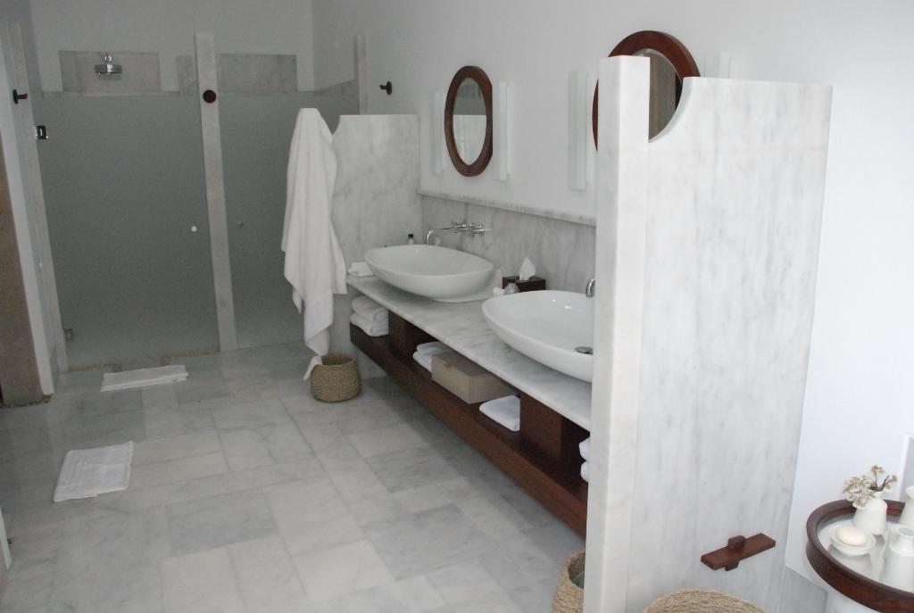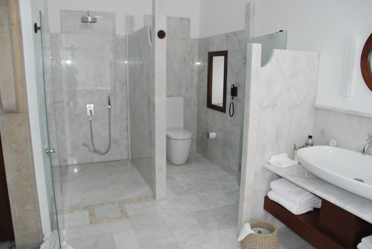 И в данном проекте Bianco Carrara смотрится самодостаточно и элегантно. Им облицован пол и частично - стены. Интересная и весьма оригинальная идея прослеживается в некоторых деталях интерьера. К примеру, каменные "ширмы", обрамляющие зону умывальника. Или декоративные колонны-столбы.