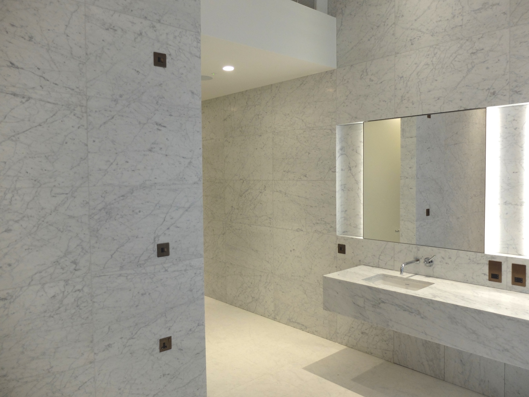 Для проекта была заказана крупная прямоугольная плитка с одним направлением прожилковатого рисунка. Едва заметный голубоватый оттенок мрамора привносит в помещение атмосферу свежести и чистоты.