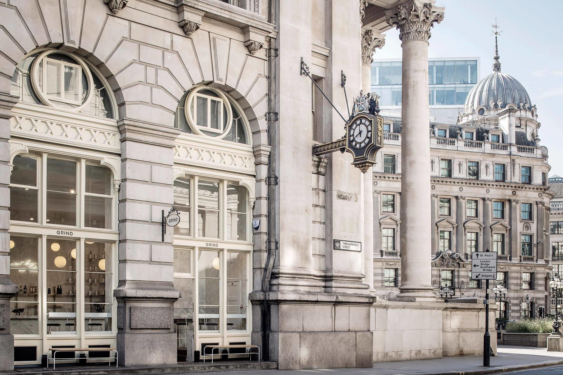 Перед нами кафе, расположенное в здании лондонской биржи - старинном здании, основанном в 16 веке. В 2011 году проект реставрации и создания интерьера был поручен австралийской студии Biasol. "Этот проект предоставил нам поистине уникальный опыт в одном из самых узнаваемых архитектурных сокровищ Лондона," - поделился главный архитектор Biasol. - "Это было очень важно, наш подход отразил великое почтение к истории Королевской биржи." Biasol досконально изучил историю этого пространства, чтобы соблюсти и подчеркнуть его яркие стилистические черты.