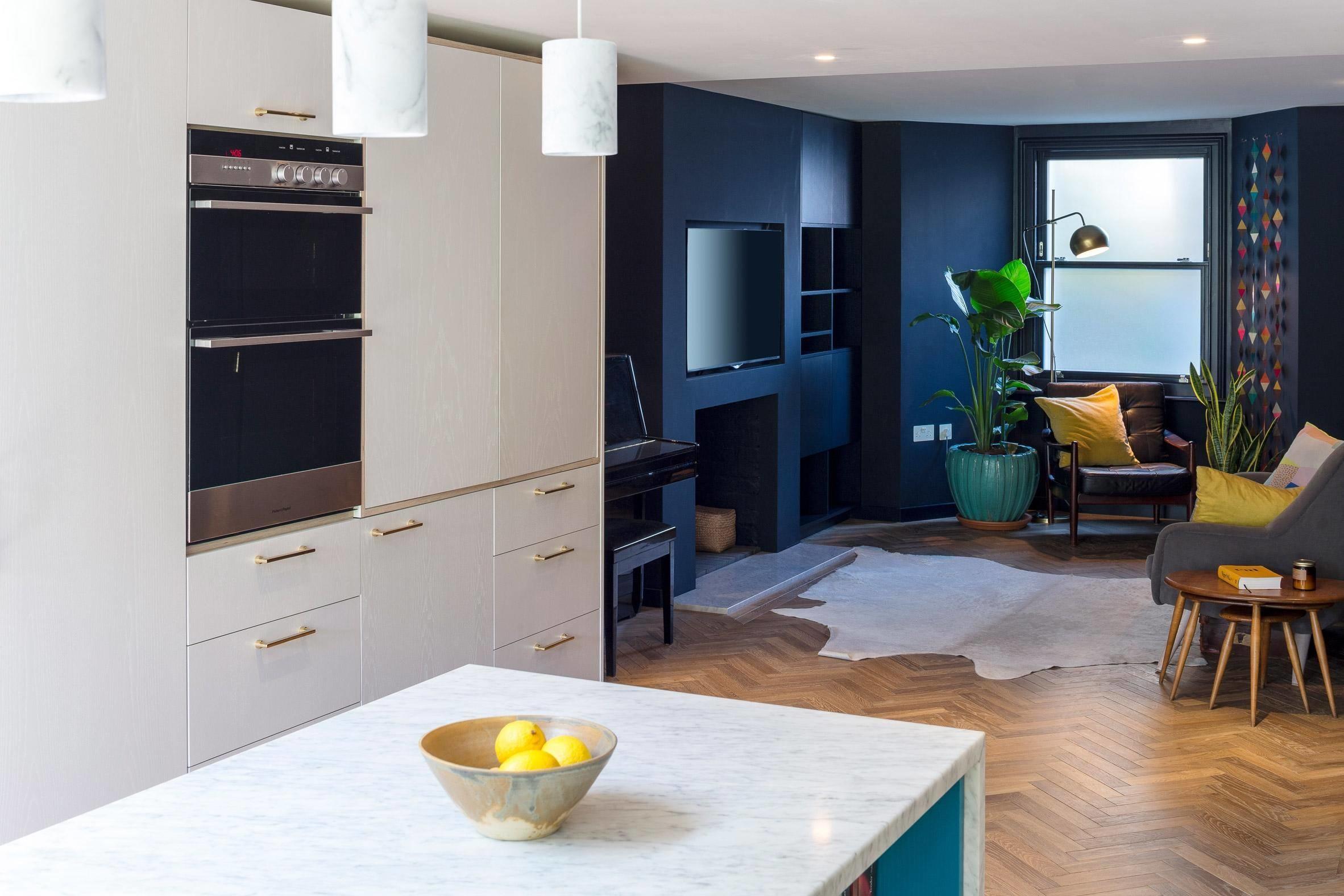 Перед нами стильный и современный проект кухни, совмещенной с гостиной. Популярный сегодня стиль контемпорари, к которому в этом проекте стремился дизайнер, подразумевает сочетание разноплановых элементов: простая деревянная мебель и дорогой камень, классические расцветки вместе с яркими элементами, немного небрежный порядок..