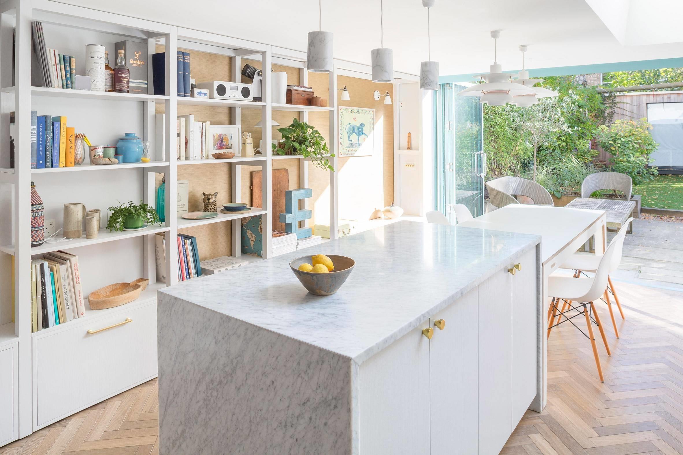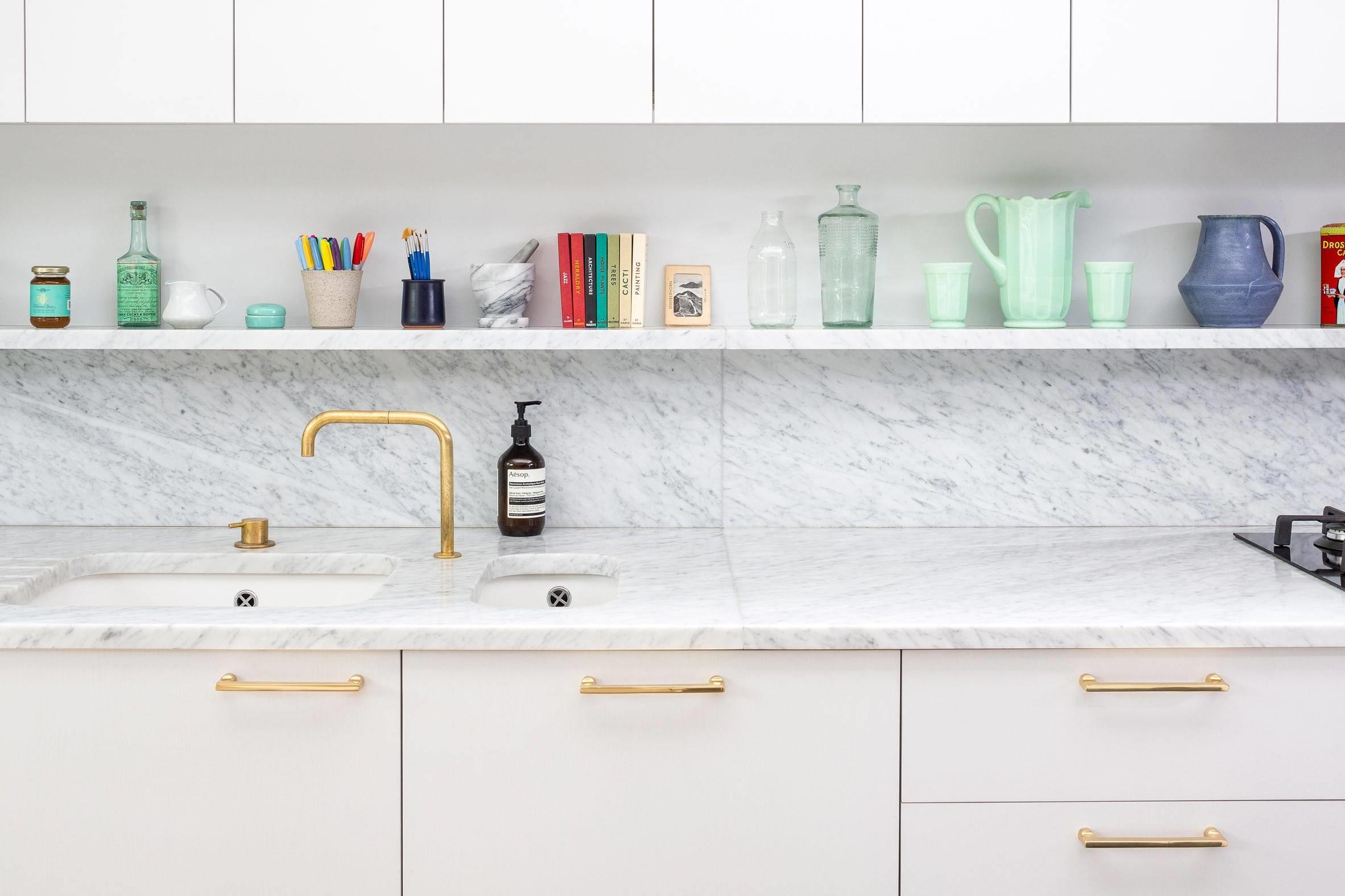 Все столешницы выполнены из самого знаменитого в мире мрамора - Bianco Carrara из Италии. Голубовато-белый с частой сетью серых прожилок - он всегда смотрится благородно и дорого. Центральный остров представляет собой П-образную конструкцию. Этим же камнем облицована рабочая зона: поверхность, фартук и нависающие полки.