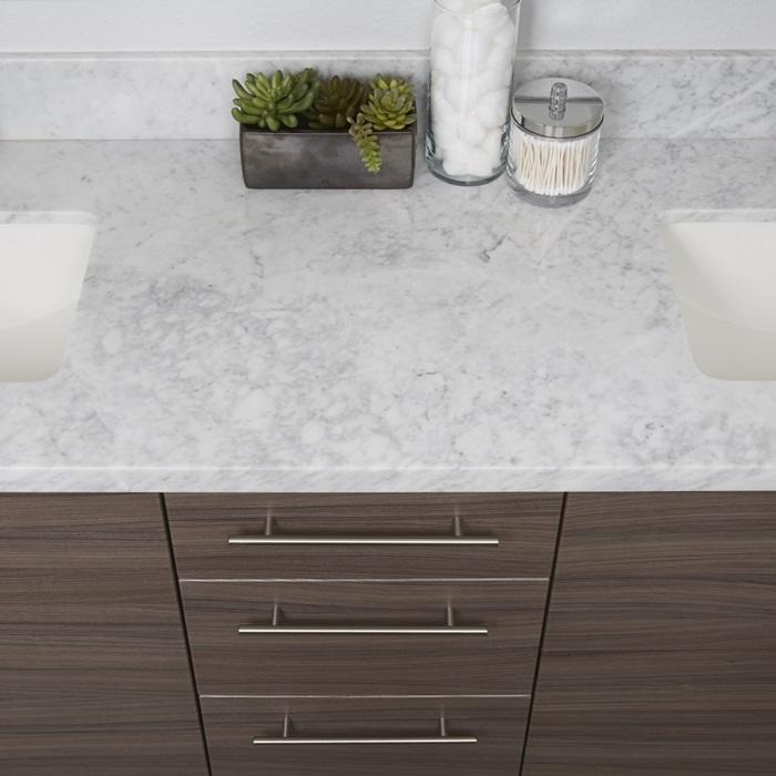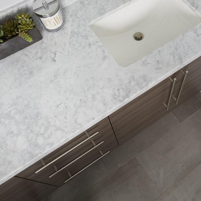 Из легендарного итальянского мрамора Bianco Carrara, история которого исчисляется тысячелетиями, выполнена столешница на кухню. Рабочая зона по периметру покрыта трехсантиметровыми плитами этого мрамора.