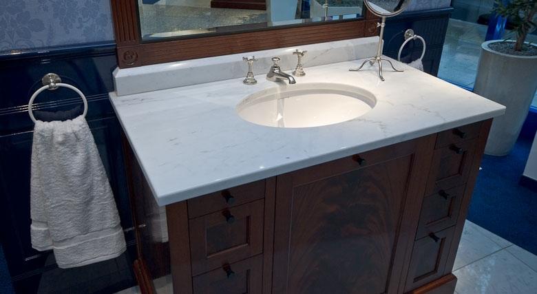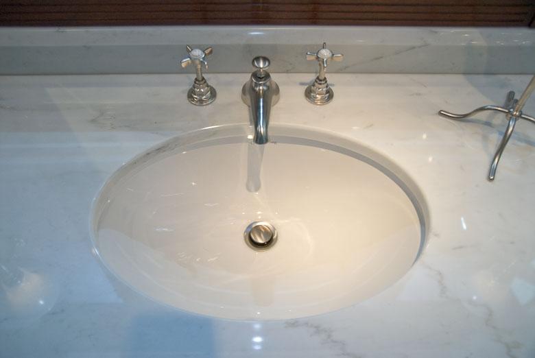 Здесь этот камень использован для покрытия тумбы с встроенной раковиной. В проекте был использован полуслэб толщиной 3 сантиметра. В нем вырезаны необходимые отверстия: под краны и овальное - под раковину.