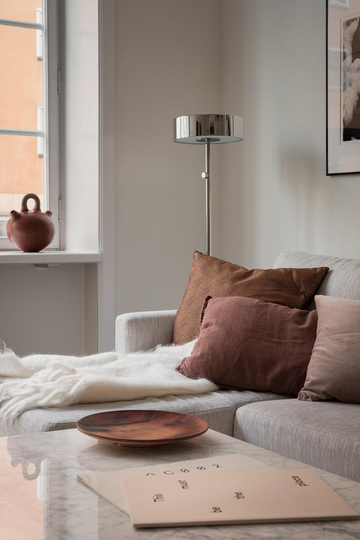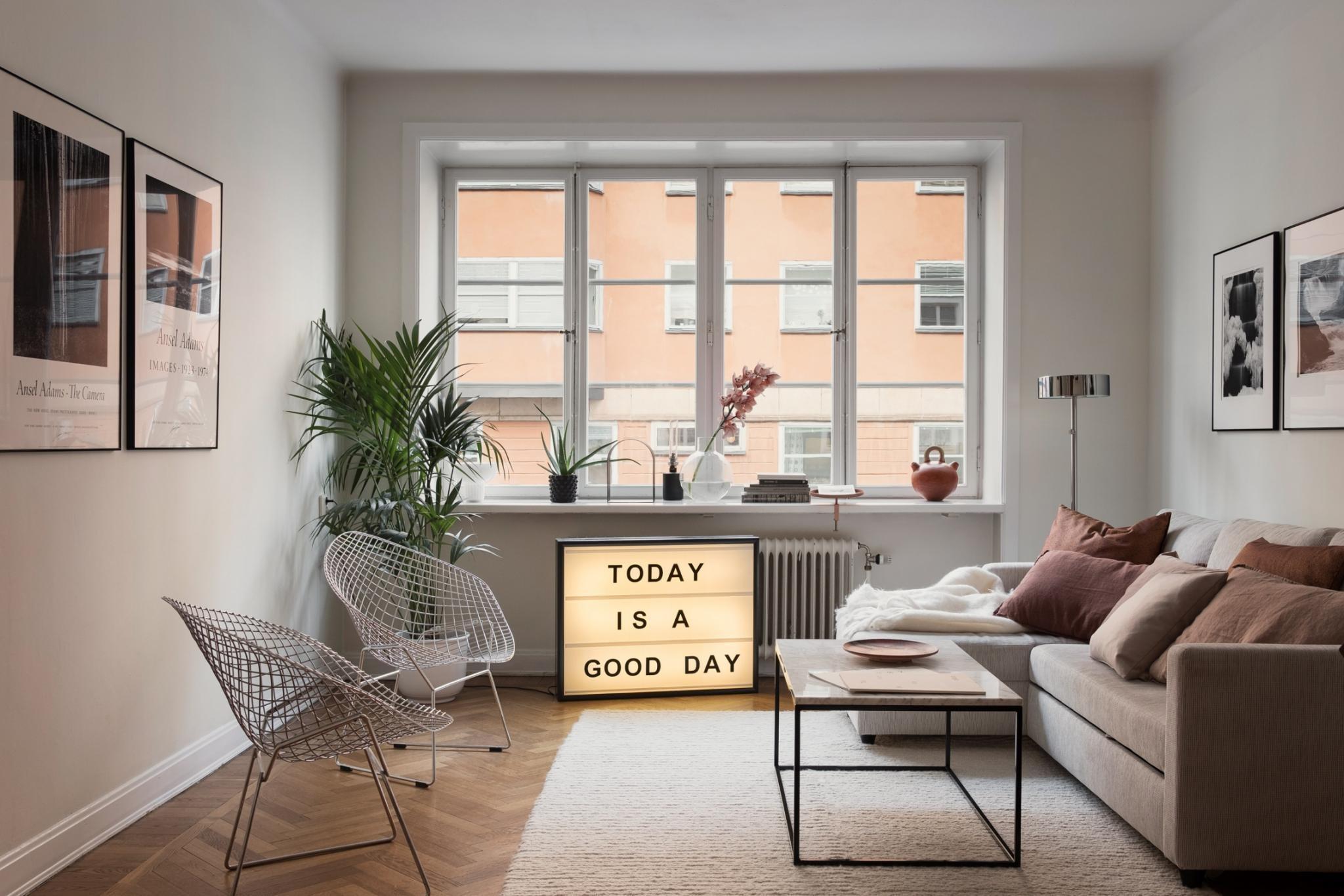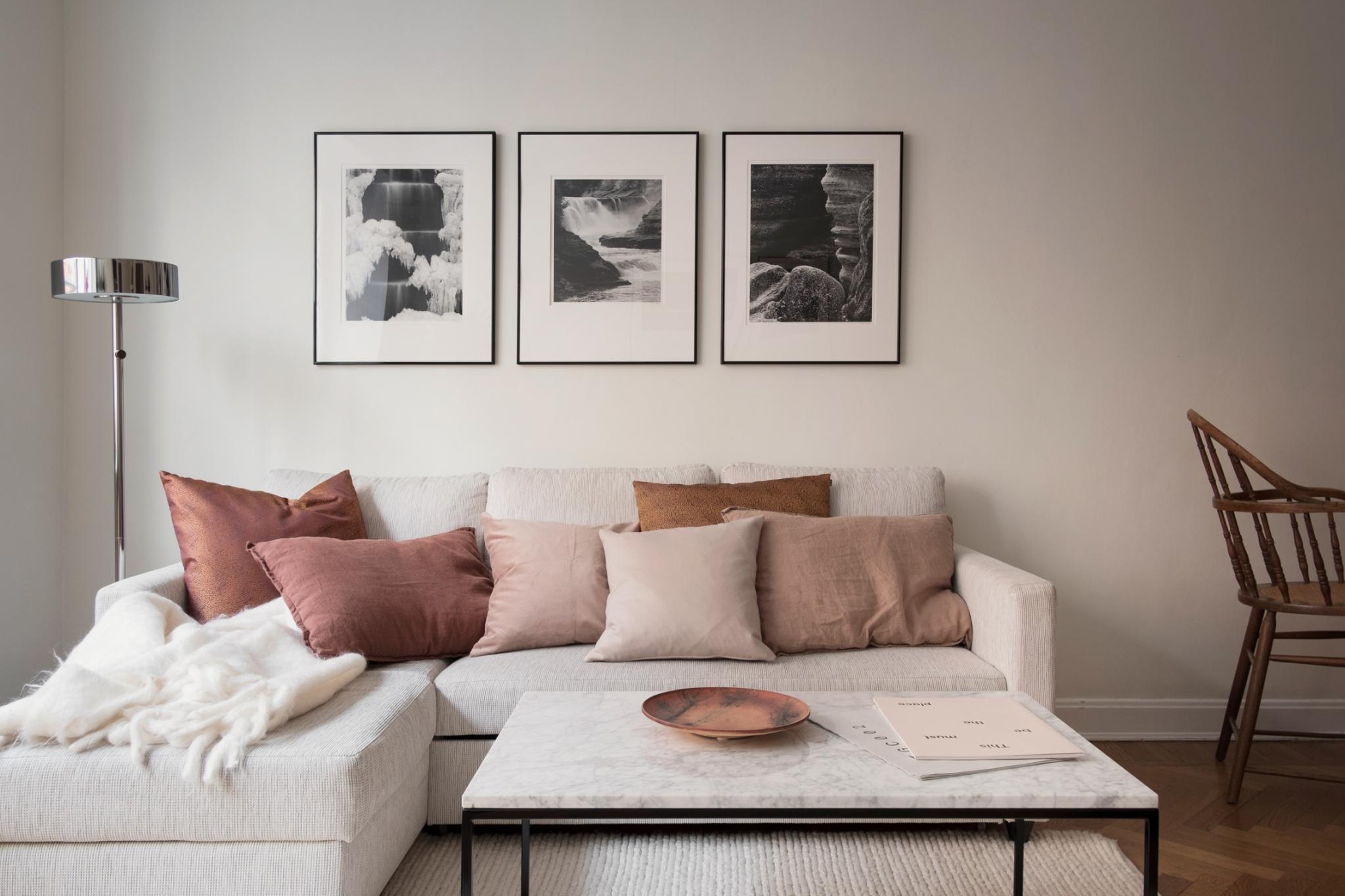 Журнальный столик из белого мрамора стал органичной частью этого интерьера в скандинавском стиле. Столешница из прожилковатого каррарского камня крепится на прямоугольном металлическом каркасе. Такой столик смотрится очень современно, лаконично, элегантно. Классическая красота легендарного мрамора актуальна всегда, даже в формате весьма демократичного стиля большого города.