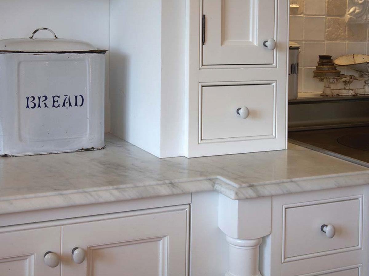 Дизайнер очень удачно выбрал фактуру поверхности столешниц - это лощение. Лощеный Bianco Carrara приобрел более светлый тон и мягкую бархатистую поверхность.