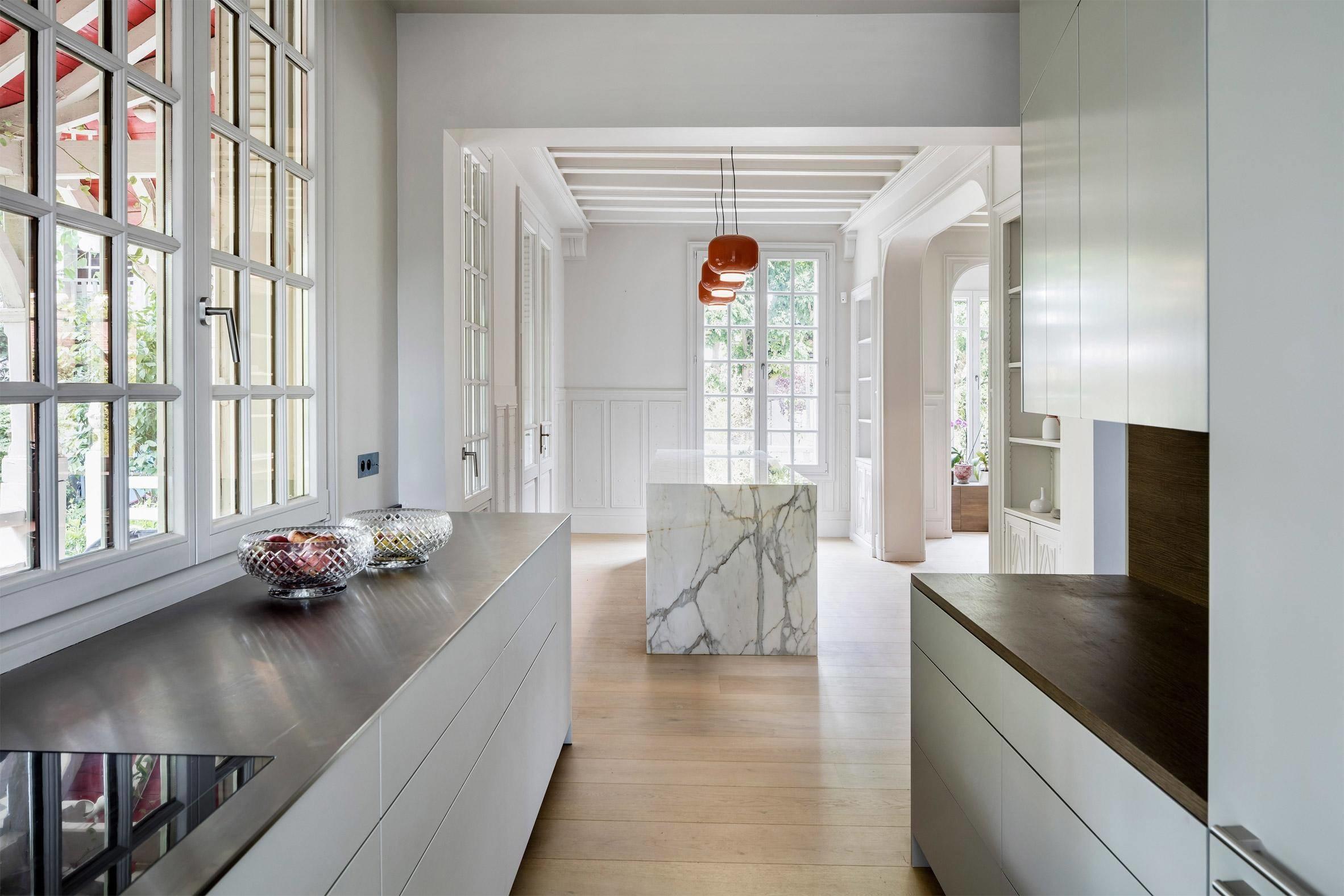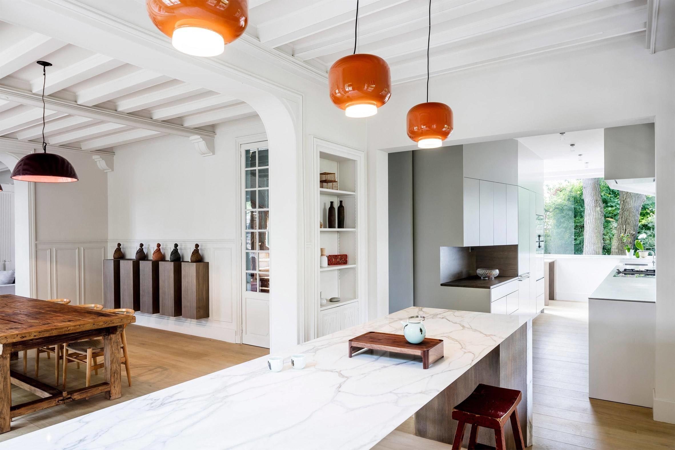 В этом проекте дизайнер решил использовать один из самых изысканных итальянских сортов мрамора - Calacatta Gold. Это белоснежный скрытокристаллический камень с выразительной сетью золотистых прожилок.