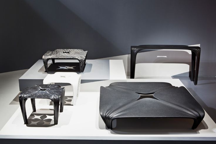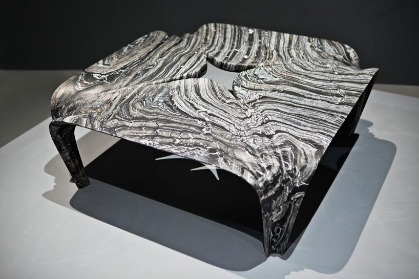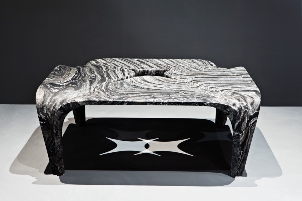 Играя с природной пластичностью мрамора, со светотенями рельефной поверхности и индивидуальным рисунком каждого каменного блока, Заха помогает нам посмотреть на камень абсолютно новым взглядом. Создается впечатление, что в ее руках мрамор приобретает податливость и текучесть глины. Фактура поверхности стола, будто бы имитирует складки небрежно брошенной ткани.