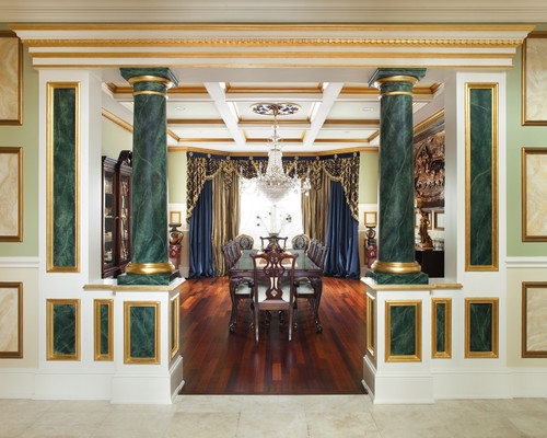 Перед Вами реализованный проект обеденной комнаты, по роскоши не уступающий императорскому дворцу. Колонны и декоративные выемки в стенах выполнены из индийского мрамора India Green (Verde Guatemala) насыщенно-зеленого цвета.