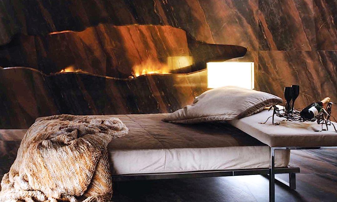 Этот уникальный интерьерный проект реализован легендарной компанией Antolini. Итальянские каменщики выбрали кварцит Copper Dune, привезенный из Бразилии, для комплексной отделки всего пространства спальни.