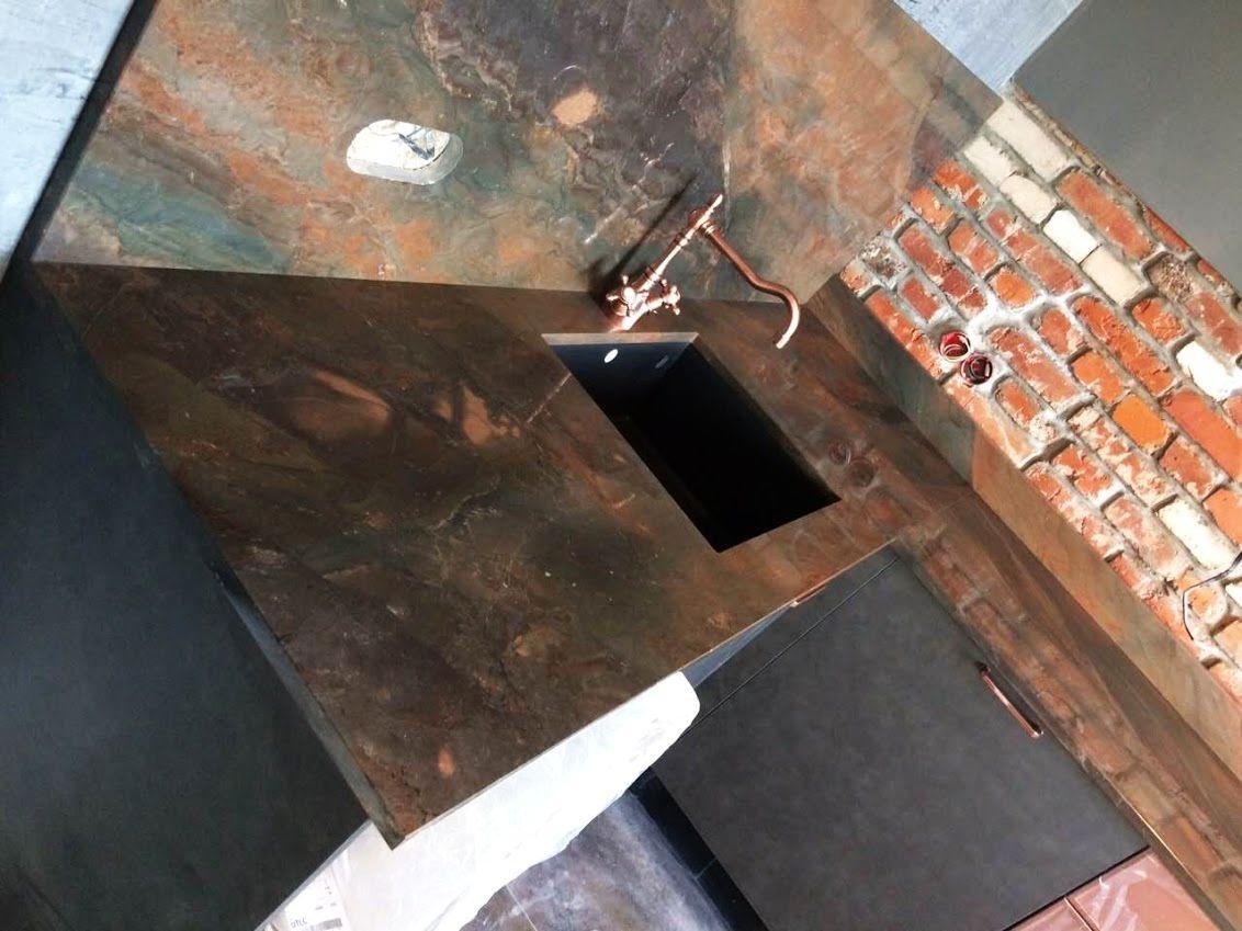 Кварцит Copper Dune - довольно редкий камень с переходами цвета в диапазоне оттенков: коричневого, красного, оранжевого и серого. Он превосходно сочетается с красным кирпичом, бетоном и всеми элементами этого брутального стиля.