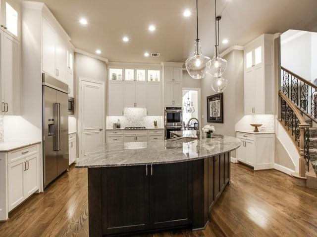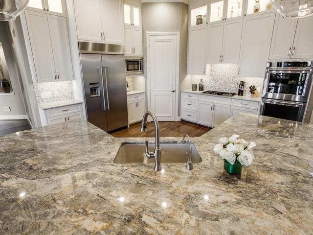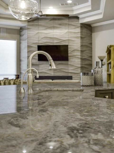 Центральная столешница для этой кухни выполнена из 2-сантиметрого слэба кварцита Cielo. Мастера выполнили свою работу превосходно: на изделии почти незаметны стыки и швы.