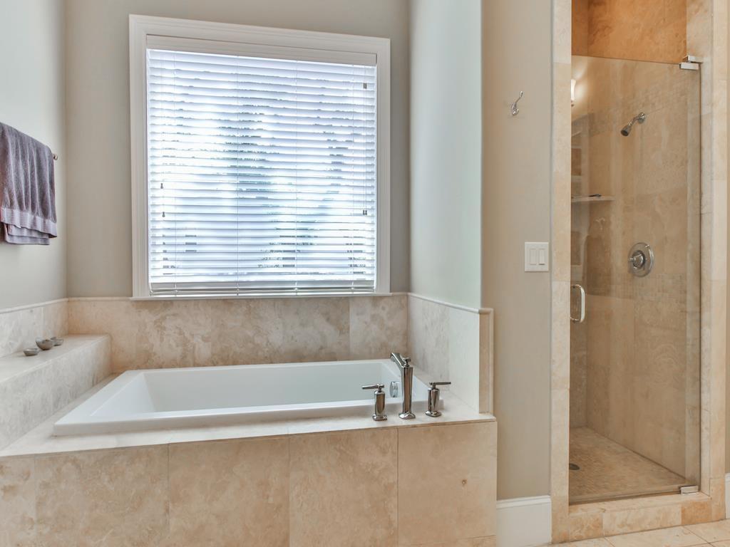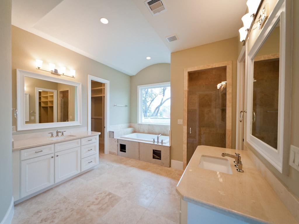 Для отделки были задействованы два вида камня кремового оттенка: мраморизованный известняк Crema Marfil и травертин Travertine Cream.