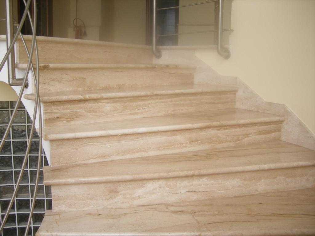 Винтовая лестница с большим диаметром и полы в бизнес-центре облицованы полированным бежевым мрамором Diano Reale. Площадки выложены квадратной плиткой камня, а ступени и подступенки - цельными элементами.