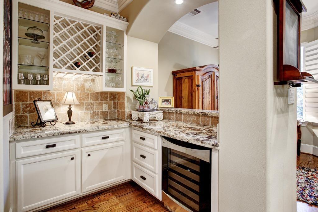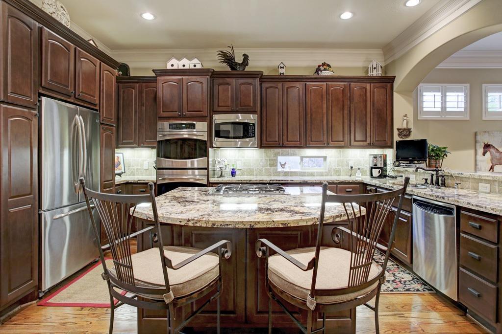 Все рабочие поверхности, а также столешница центрального острова, покрыты этим камнем. Для проекта были задействованы слэбы толщиной 2 сантиметра с полированной фактурой. На торцах каждая столешница укреплена подклейкой дополнительной полосы, отчего изделия кажутся массивными и основательными.