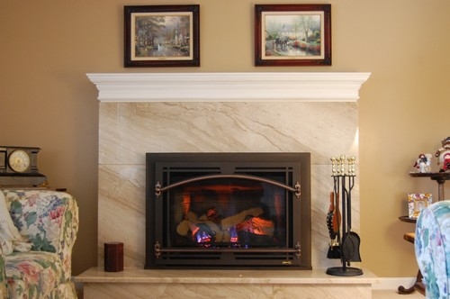 Это каминный портал выполнен из полированного мрамора Diano Reale. Из него же изготовлена нижняя каминная полка, им облицован пол вокруг камина.