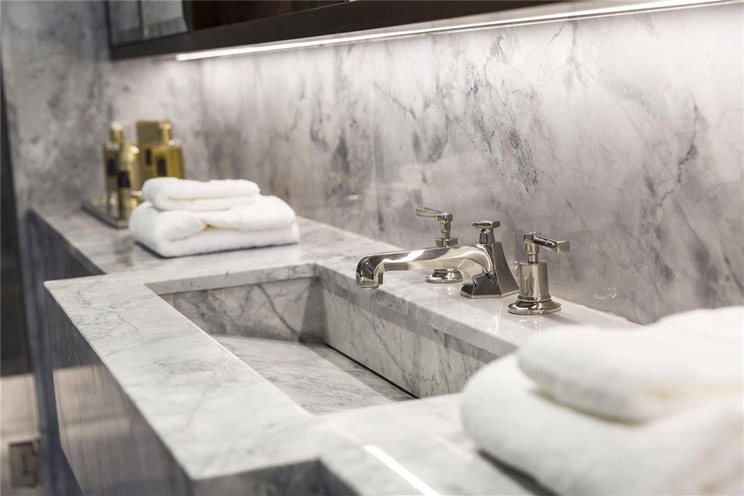 Что касается самого камня, Bianco Eclipse - уникальный сорт. Это кварцит, но, на первый взгляд, кажущийся классическим прожилковатым мрамором светло-серого цвета. В силу своего состава (состоит из чистого кварца), этот камень напрочь лишен недостатков, свойственных для мрамора. Он не реагирует на повышенную влажность, не подвержен возникновению пятен, не боится механических воздействий и едких бытовых веществ. Содержание этого камня в чистоте - задача осуществимая и несложная.