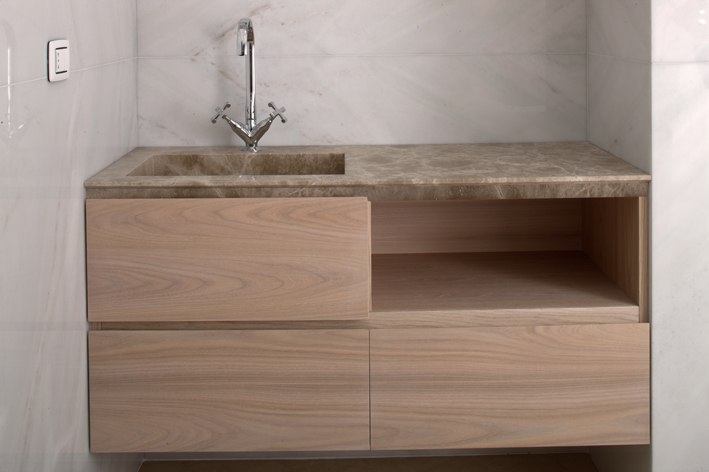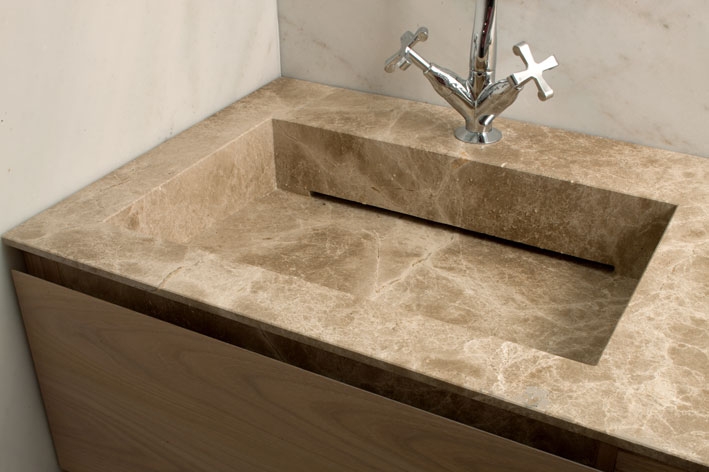 Цельные раковины из камня всегда смотрятся стильно и дорого. Путей реализации этой довольно функциональной идеи - великое множество. Сочетание красивого камня и стилистики раковины подбирается индивидуально, и каждый подобный проект смотрится неповторимо. Данное изделие разработано по уникальному проекту путем множественной склейки мраморных элементов. Раковина очень органично переходит в столешницу.