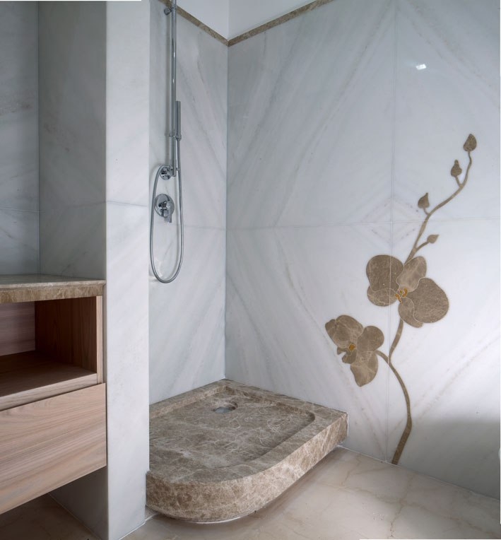 На третьей фотографии мы видим, что поддон в душевой кабине также вырезан из этого мрамора.