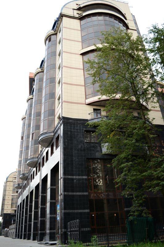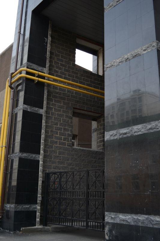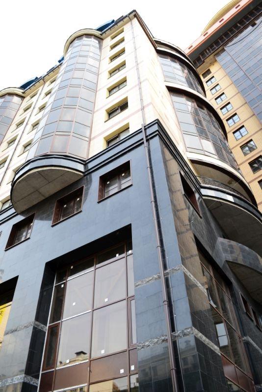 Мы изготовили квадратную плитку с полированной фактурой - для отделки большой площади фасада, а также нижнего яруса, проходящего по нижним балконам. Мы же делали полосы с колотой поверхностью (такая фактура носит название "скала"), которые чередуются с глянцевой плиткой. За счет этого сочетания создается основательный и фундаментальный вид здания. Колотый серый камень сочетается с бетонным материалом лестницы и шлифованным гранитом на ступенях.