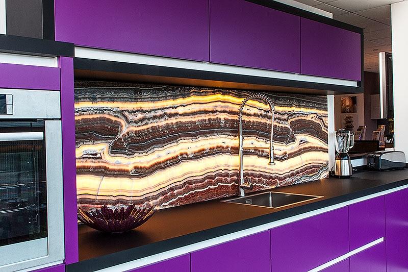 Заказчик решил разбавить матовую гладь искусственных материалов при помощи фартука из натурального мраморного оникса. Из всего многообразия сортов был выбран Onyx Fantastico - пестрый, полосчатый, с контрастными полосами полупрозрачного и темно-красного цвета. Темные вкрапления интересено сочетаются с кухонным гарнитуром ярко-фиолетового цвета.