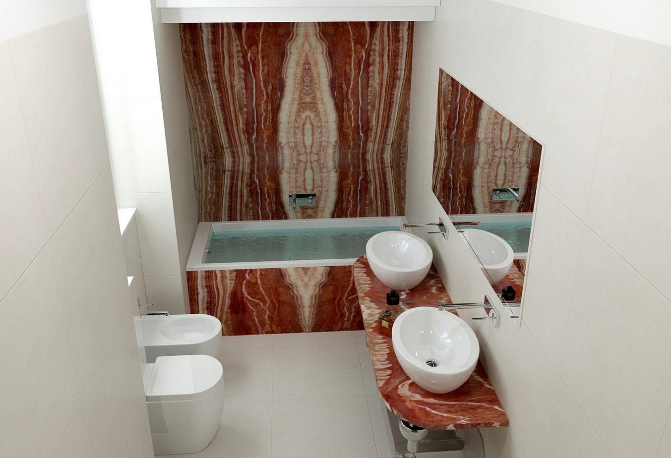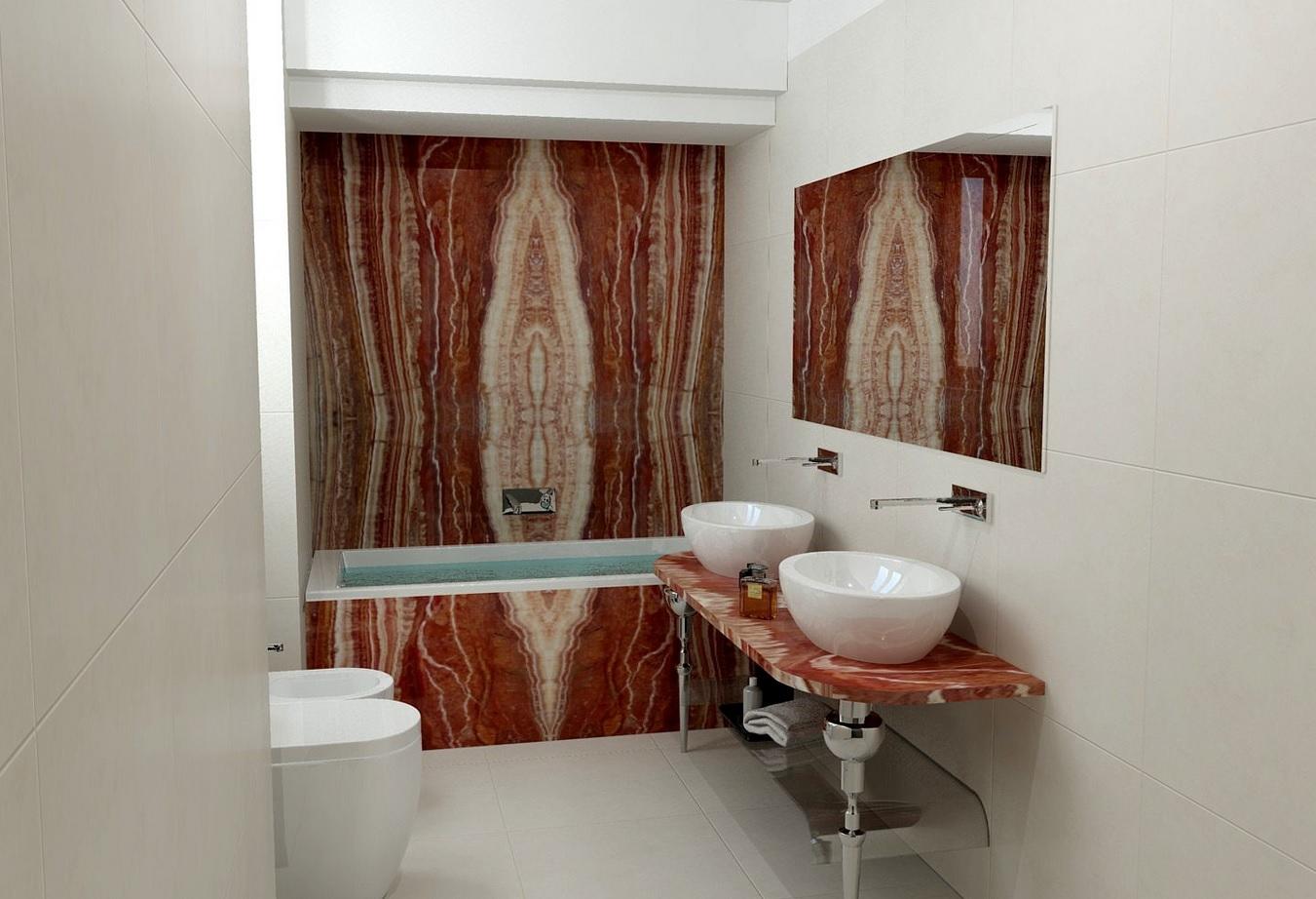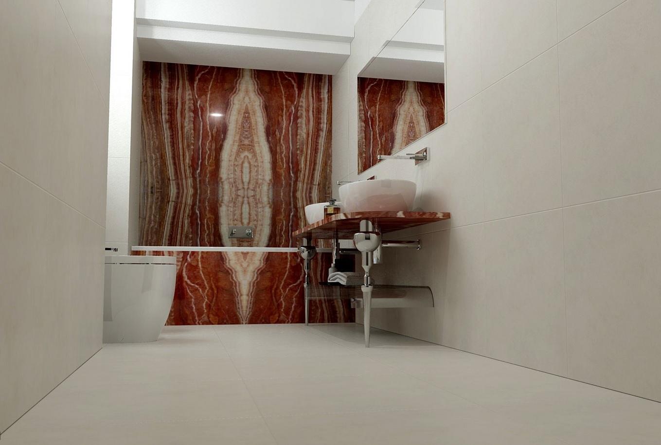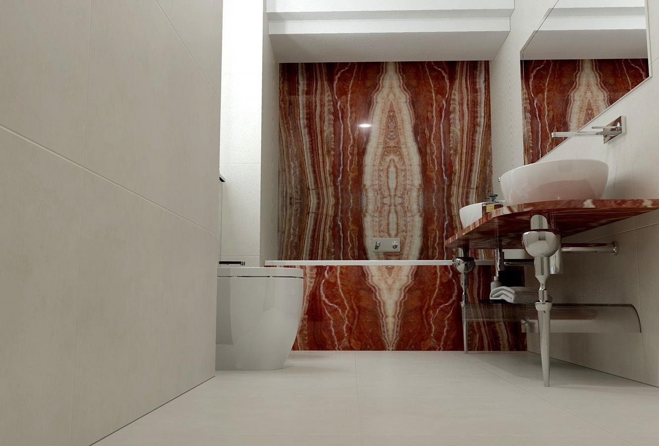 В данном проекте элементы из оникса (стена, постамент для ванной и столешница) визуально противопоставлены фоновому пространству в бледно-бежевой гамме. Они подчиняют себе все помещение, не оставляя внимания к остальным деталям. Этот камень самодостаточен, он не допустит в своем окружении сложного дополнительного декора.