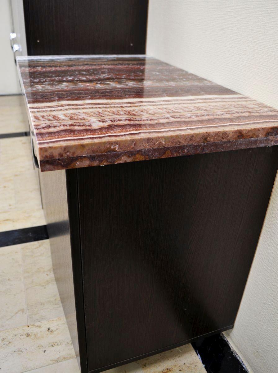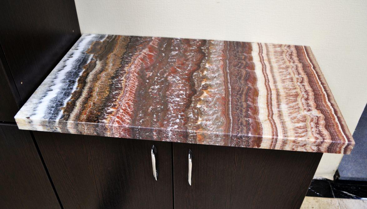 Тумба офисного гарнитура украшена столешницей, выполненной из одного из самых ярких сортов мраморного оникса - Onyx Fantastico. Он обладает роскошной текстурой, сложенной волнистыми линиями разнообразных оттенков: красный, коричневый, оранжевый, бежевый, белоснежный, серый и голубоватый.