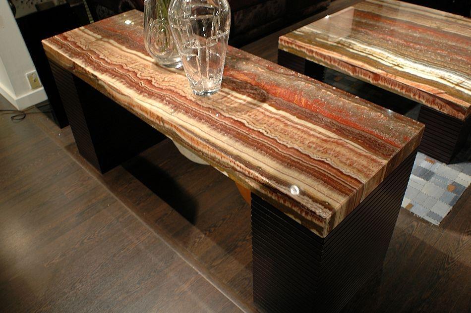 Столешницы выполнены из толстомера полосчатого Onyx Fantastico. Полированная поверхность в полной степени раскрывает богатую текстуру камня.