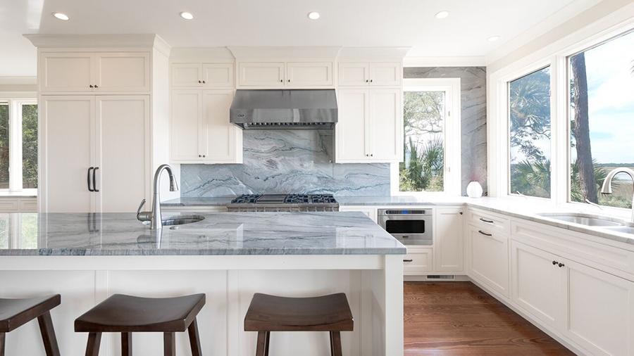 Светлая мебель прекрасно сочетается с бразильским кварцитом Fantasy Macaubas нежных пастельных оттенков. Его текстура волнистая и хаотичная, сложенная прожилками голубого, серого, нежно-зеленого и сиреневого тонов. Обладая таким воздушным, романтичным рисунком, Fantasy Macaubas является весьма твердым материалом. Он не боится механичесих нагрузок, высокой влажности и бытовых кислот. Этот камень очень и очень долговечный.