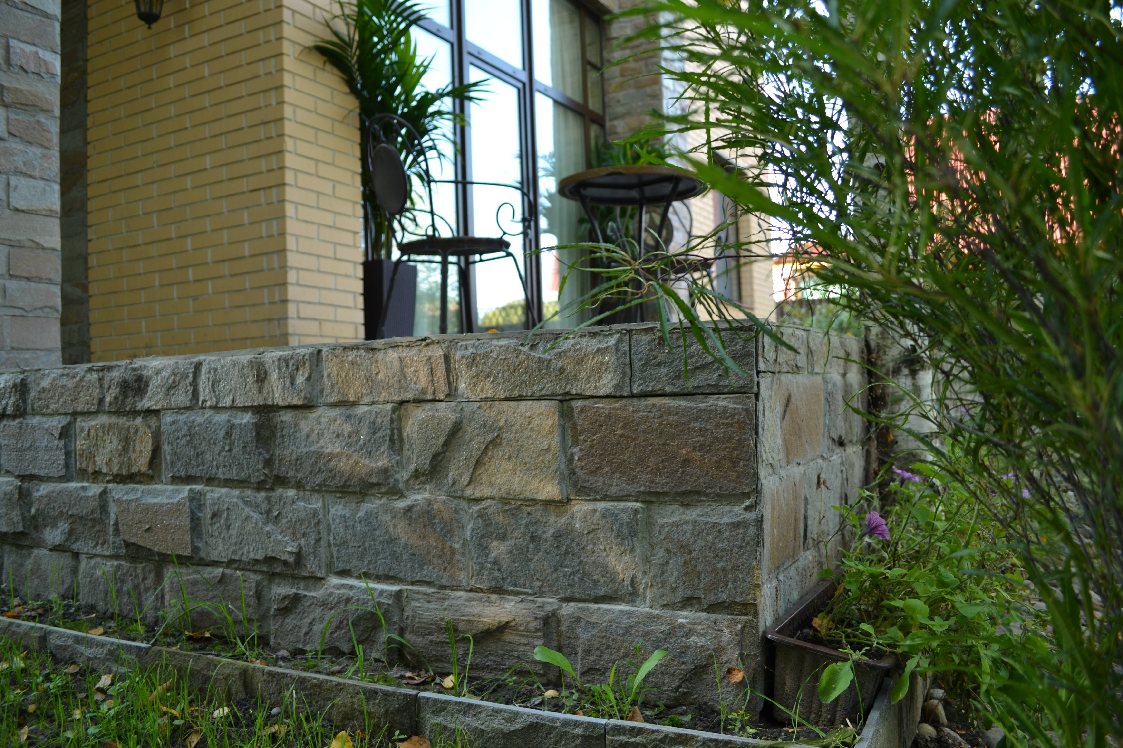 Популярный в нашей стране камень - кварцитосланец "златолит" использован для отделки фасадных и ландшафтных элементов загородного дома. Колотые плитки мерцающего кварцита органично встроену в окружающую среду, придавая архитектуре элегантный, но естественный облик. Были использованы плитки с естественным рельефным краем, и частично - обработанные под фактуру "скала". Был использован кварцитосланец серо-зеленого и бежевого оттенков. В солнечную погоду такой фасад искрится и переливается золотистыми и зеленоватыми чешуйками слюды.