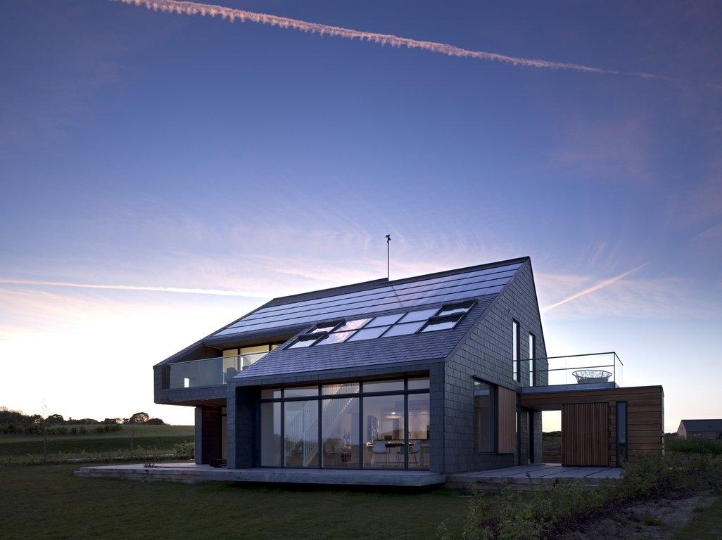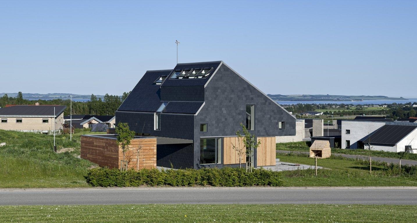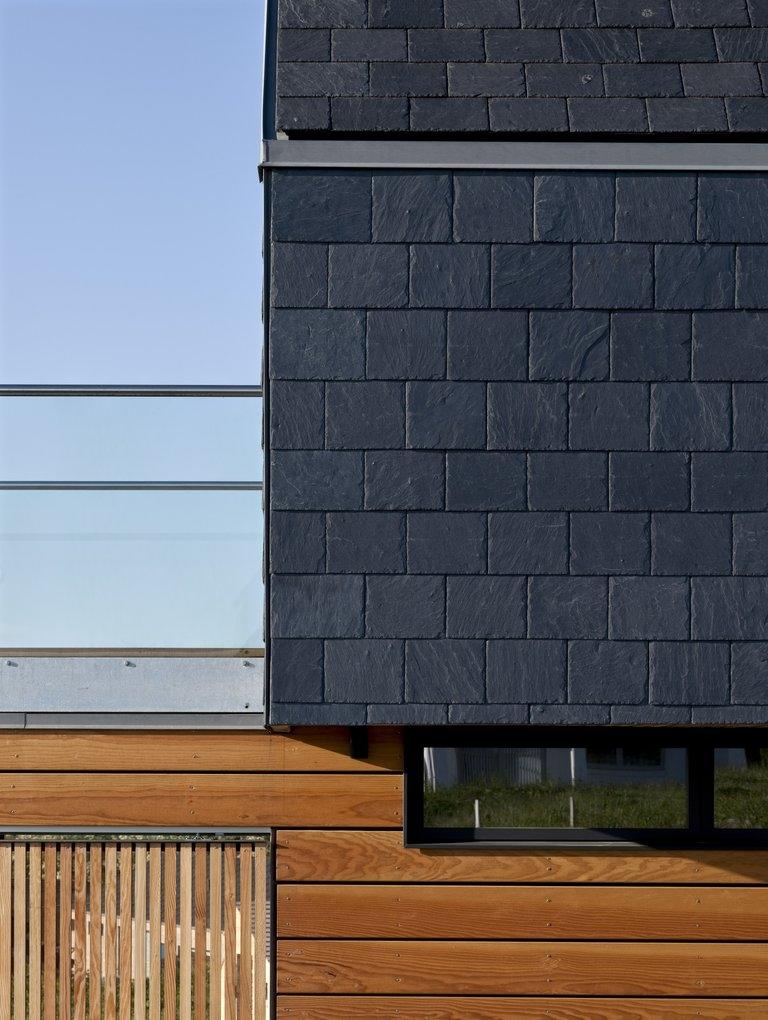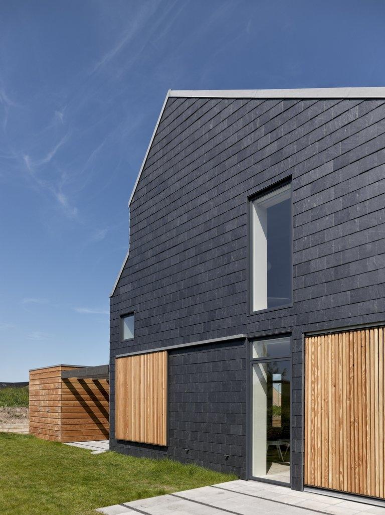 Перед нами проект современного загородного дома, выполненный на стыке стилей конструктивизм и Hi-Tech. Помимо архитектурной концепции, здесь интересен и выбор фасадной отделки. Как известно, новое - это хорошо забытое старое. А как часто сегодня мы видим черепицу, которая долгие столетия была единственным материалом для покрытия крыш? А в этом проекте чешуей из черного сланца покрыта не только крыша, но и фасад дома!