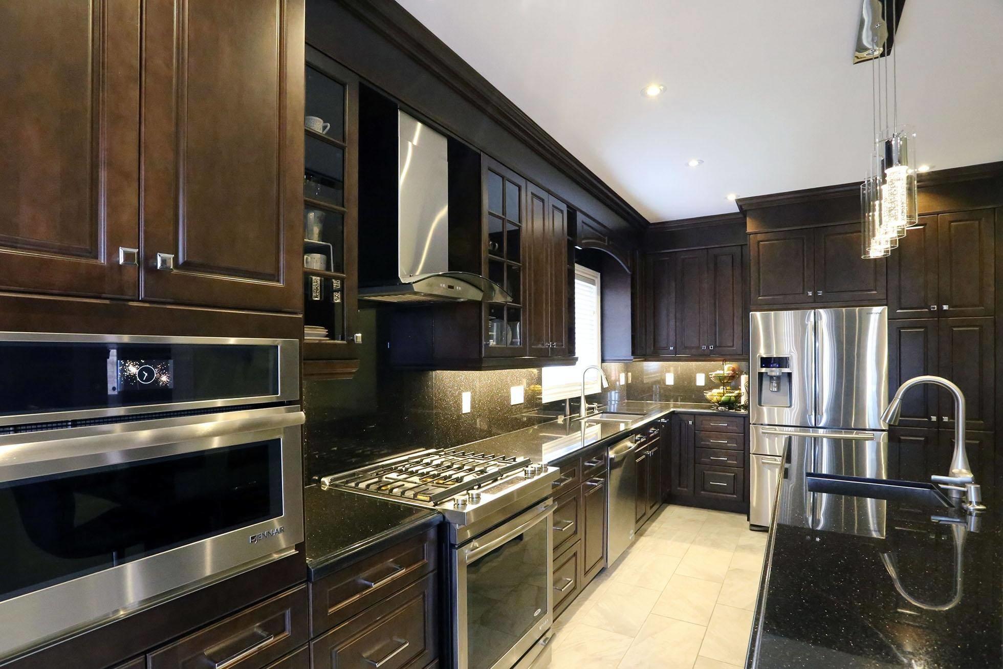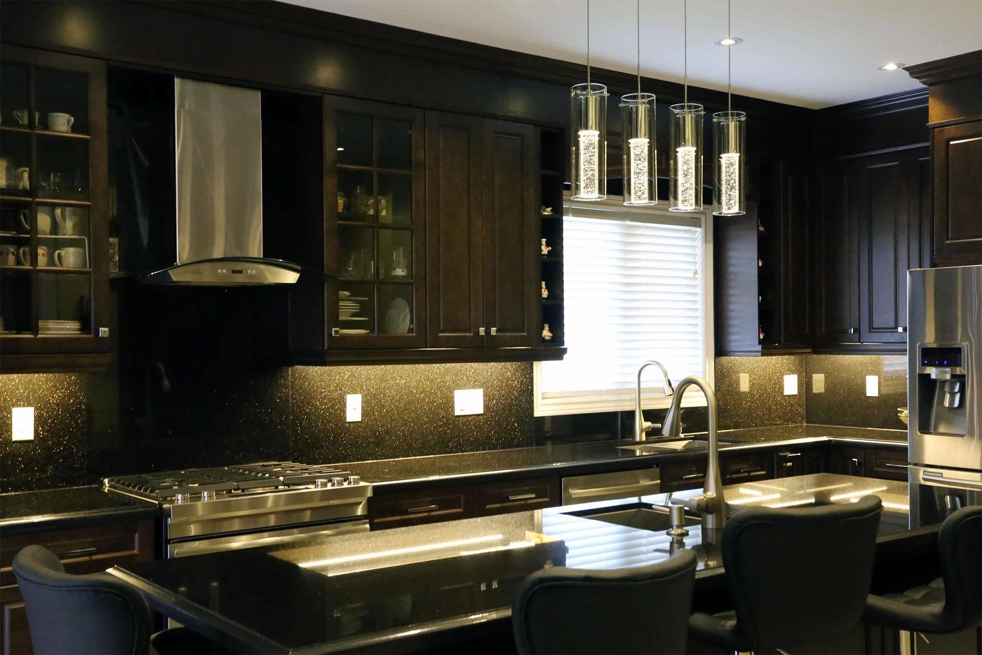 Перед нами проект стильной и функциональной кухни. Весь дизайн выполнен в темных оттенках, с элементами цвета металлик.