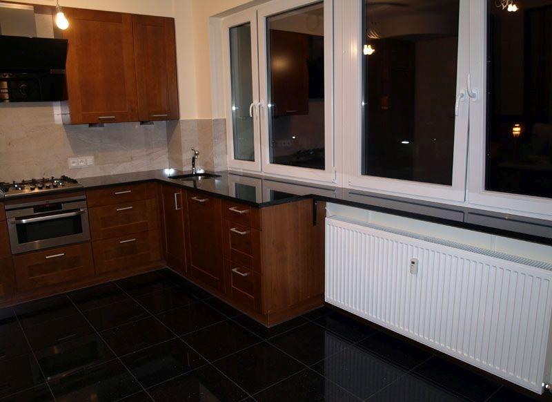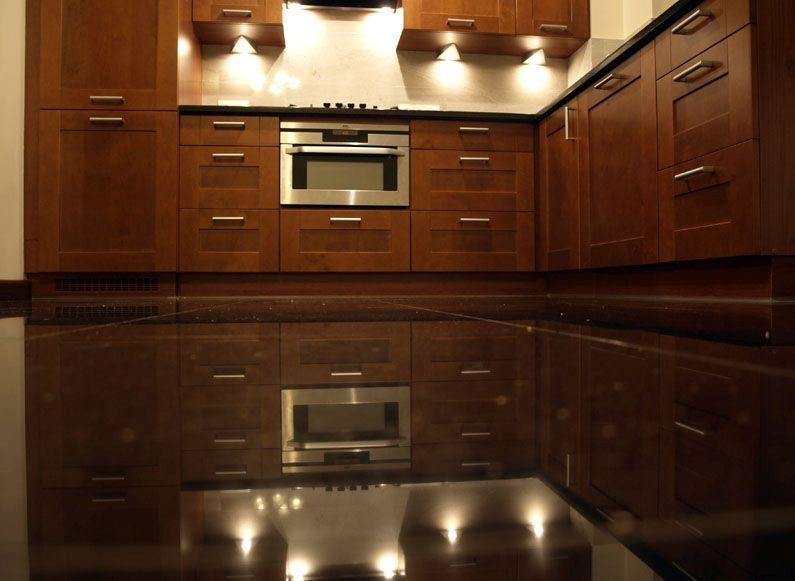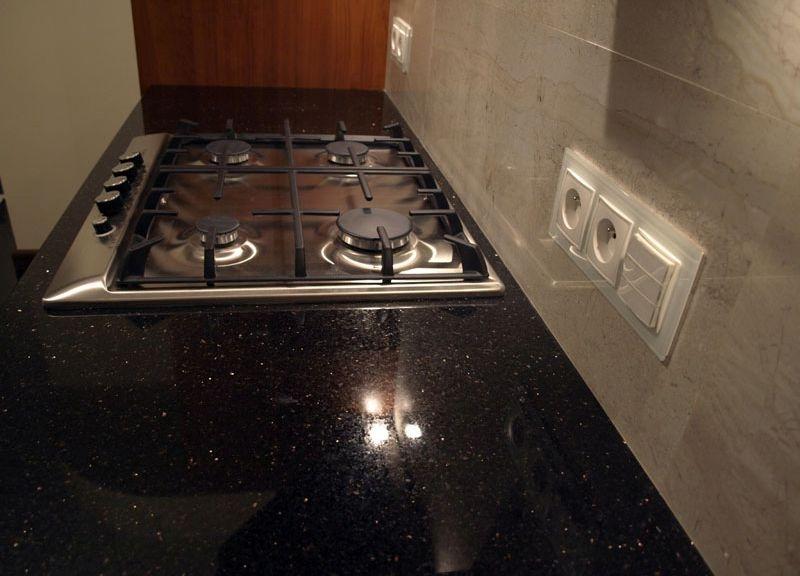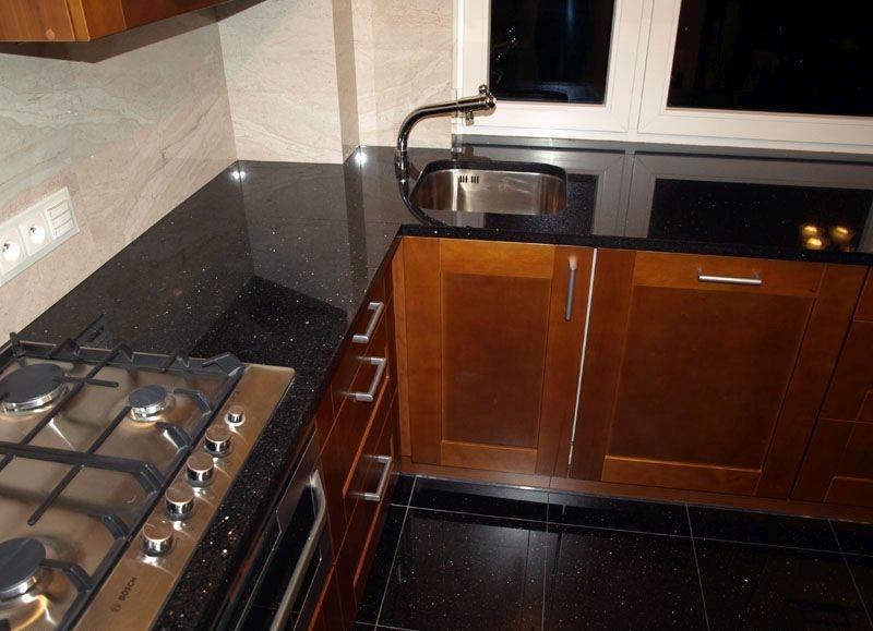 Прежде всего, из этого гранита была спроектирована столешница для рабочей зоны с вырезами под варочную зону, раковину и сантехнику. У окна столешница плавно переходит в подоконник. Как известно, Black Galaxy удивляет своими прочностными свойствами - он не восприимчив к жидкостям и бытовым веществам, его сложно поцарапать. Black Galaxy - это один из лучших материалов для создания кухонных столешниц.