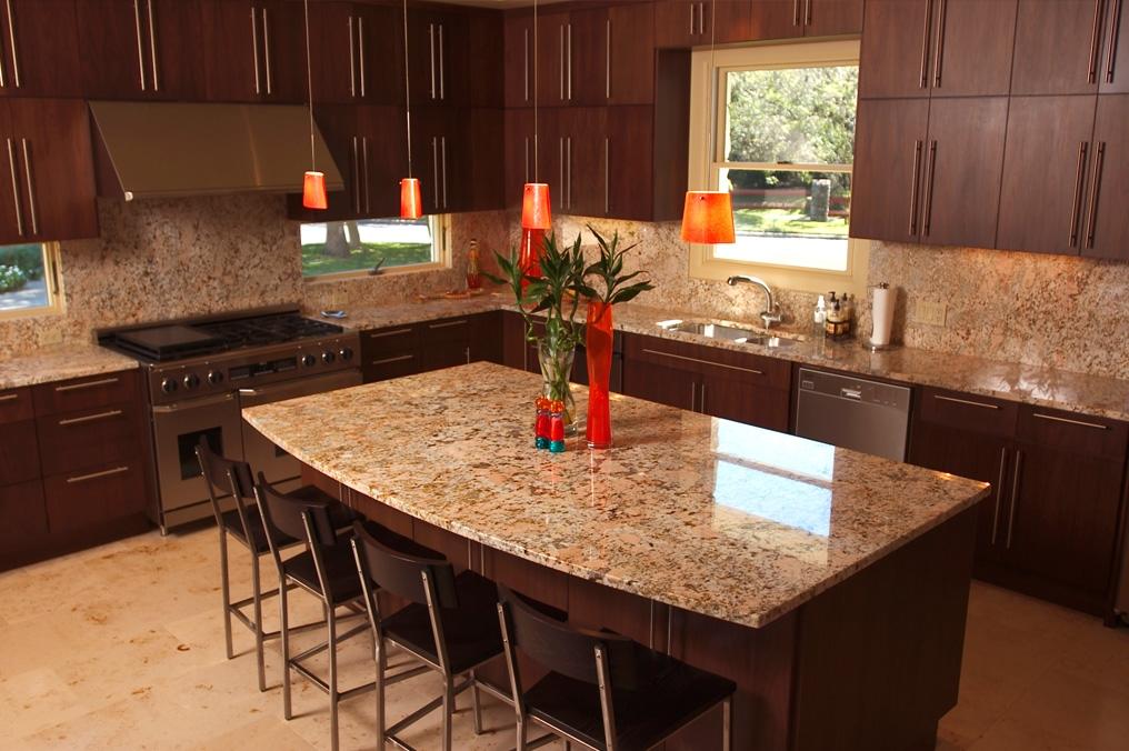 А бразильский гранит Giallo Fiorito использован для изготовления столешниц - по периметру кухни и для центрального стола-острова. Им же облицована зона фартука. При проектировании архитектор стремился к минимуму стыков и швов на столешницах и фартуке.